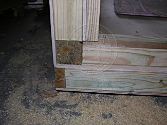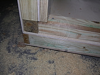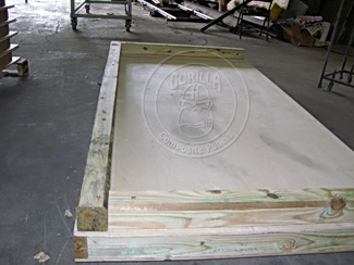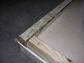 In the first photo, we are using a 4 x 8 foot floor edged in 4 x 4 inch wolmanized lumber to stay consistent with the water resistance and termite resistant properties. Here, a specific adhesive has been applied between the floor and the 4 x 4 inch base plate. A 1/4 in. x 6 in. lag bolt every 24 inches is drilled in to insure good surface to surface bond between the base plate and floor. The Gorilla recommended adhesive will vary based on what surface the base plate is being adhered to.