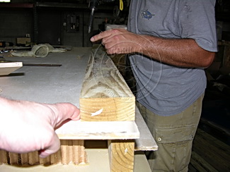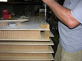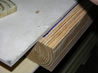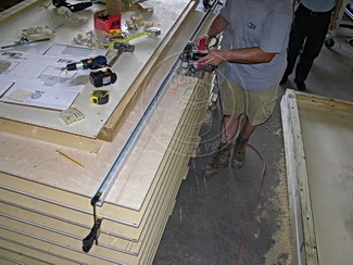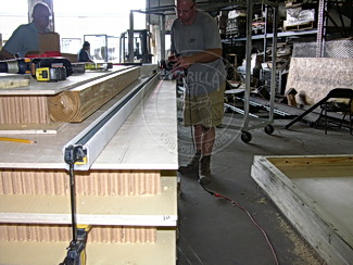 In this photo, you see a Gorilla engineer inserting a spline joint. This 4 x 4 inch wolmanized beam is glued and fasten for strength and permanent durability. Remember, the fasteners are for holding the surfaces together while the adhesive finishes are curing. Once the panel is ready it will be stood up in place, bonded and fastened. The blue line represents the center of the spline.